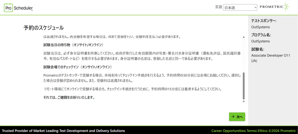 3.PROMETRICの予約ページに遷移します。