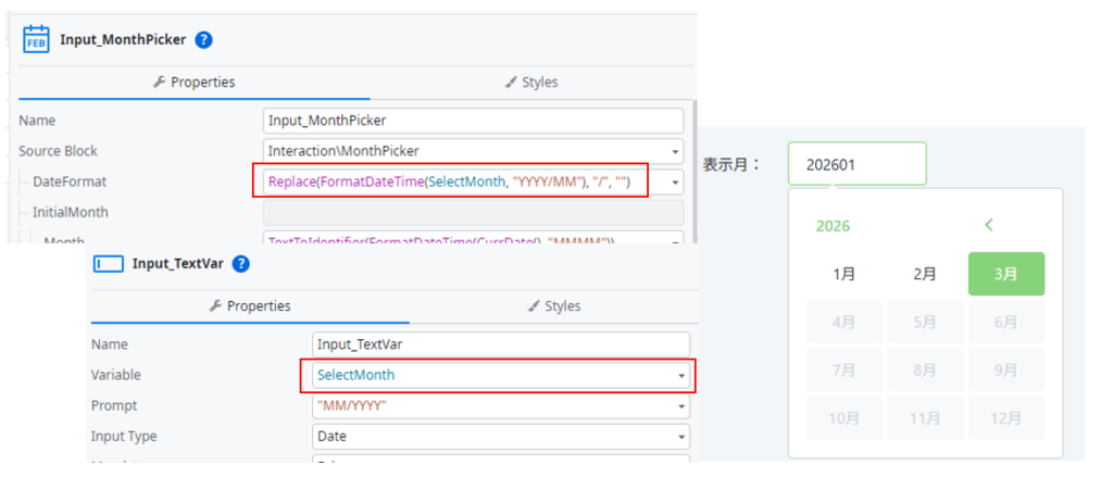 改行はInput上で表示されないため見た目は202603のように表示されます。